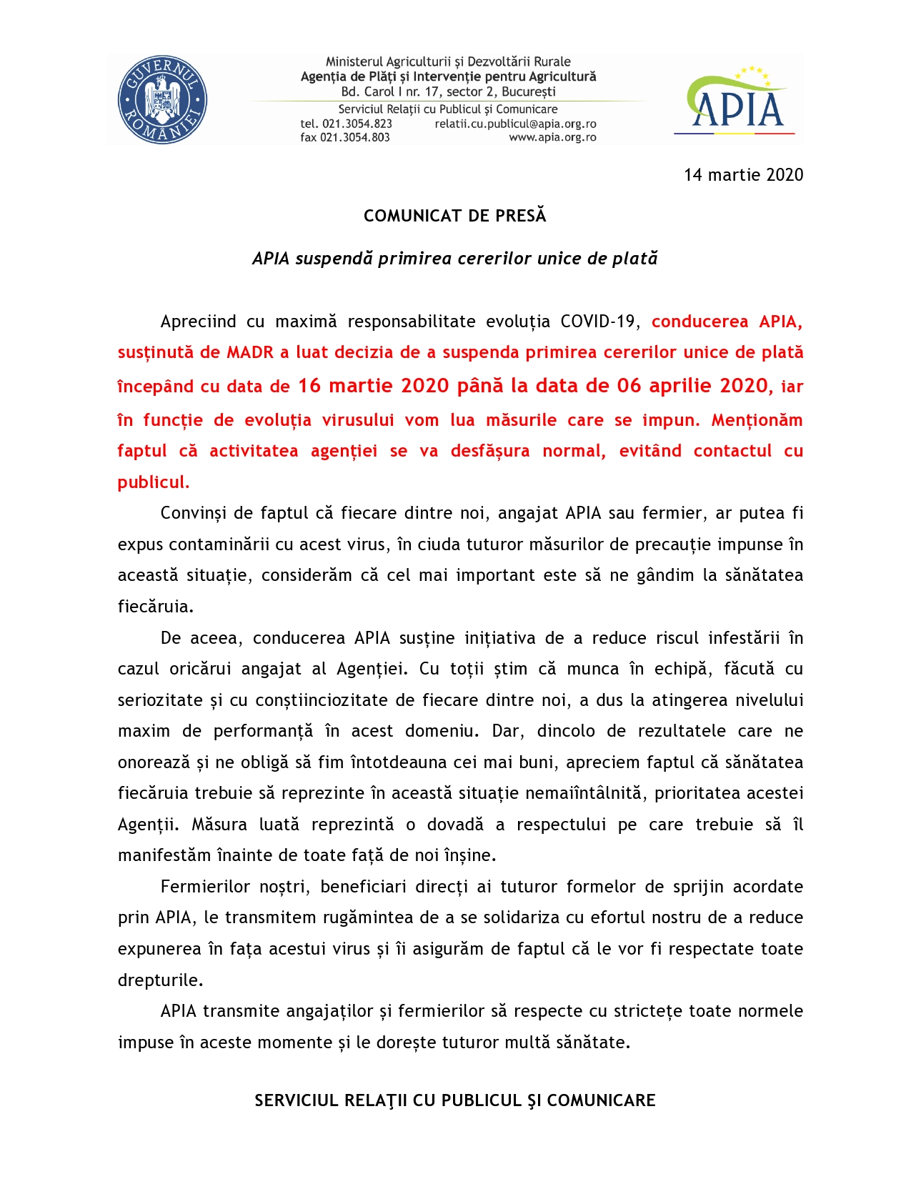 APIA suspenda primirea cererilor unice de plata. Apreciind cu maxima responsabilitate evolutia COVID-19, conducerea APIA sustinuta de MADR a luat decizia
